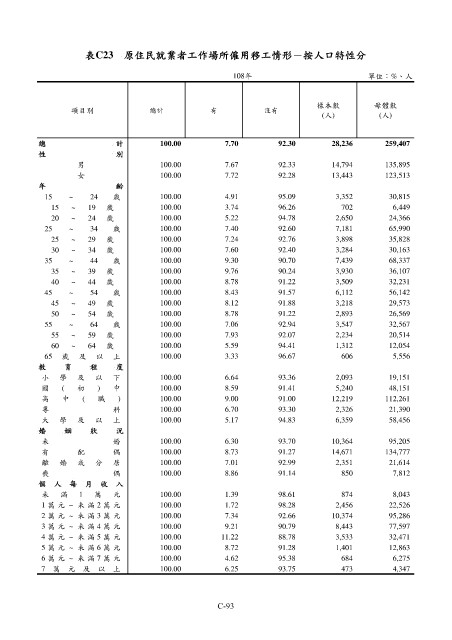 表C23 原住民就業者工作場所僱用移工情形-按人口特性分
