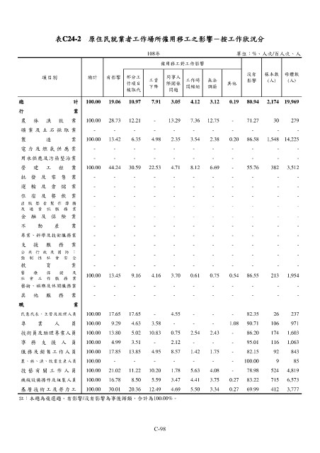 表C24-2 原住民就業者工作場所僱用移工之影響-按工作狀況分