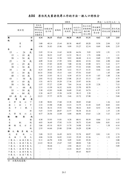 表D2 原住民失業者找尋工作的方法-按人口特性分