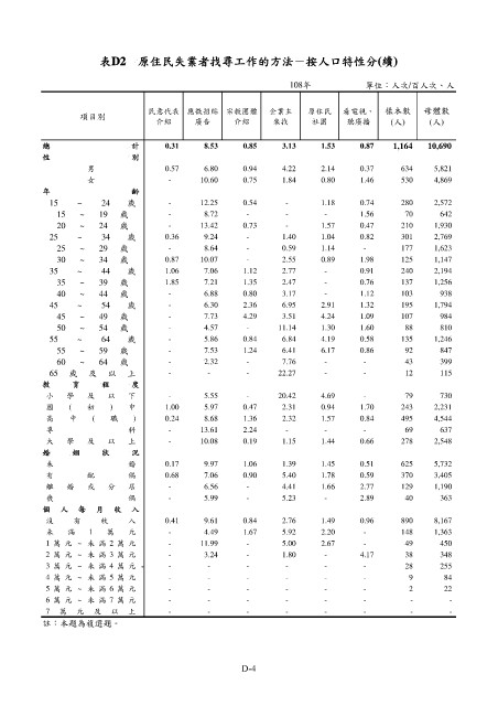 表D2 原住民失業者找尋工作的方法-按人口特性分(續)