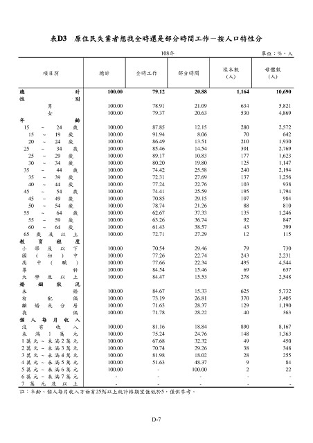 表D3 原住民失業者想找全時還是部分時間工作-按人口特性分