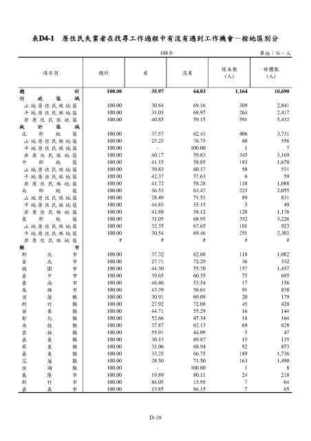 表D4-1 原住民失業者在找尋工作過程中有沒有遇到工作機會-按地區別分
