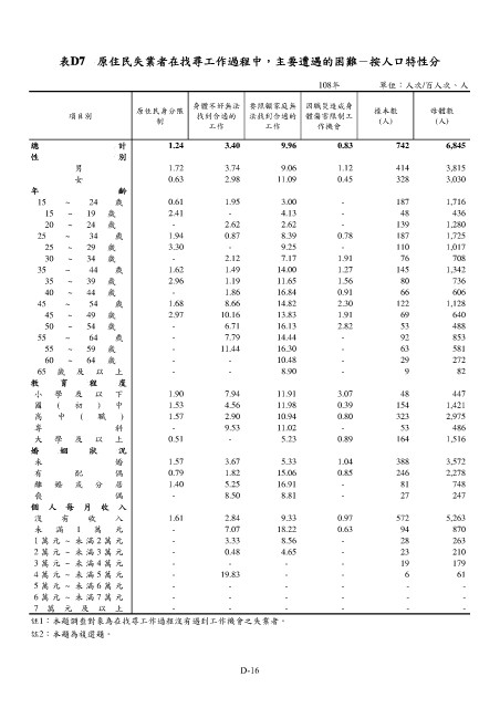 表D7 原住民失業者在找尋工作過程中,主要遭遇的困難-按人口特性分