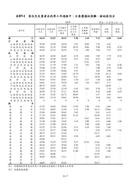 表D7-1 原住民失業者在找尋工作過程中,主要遭遇的困難-按地區別分