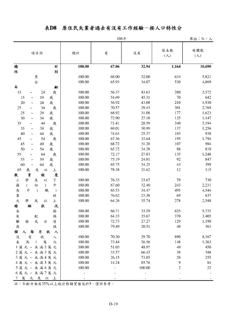 表D8 原住民失業者過去有沒有工作經驗-按人口特性分