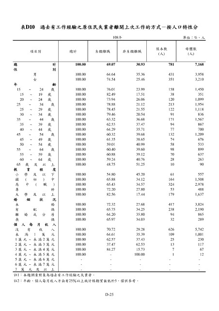 表D10 過去有工作經驗之原住民失業者離開上次工作的方式-按人口特性分