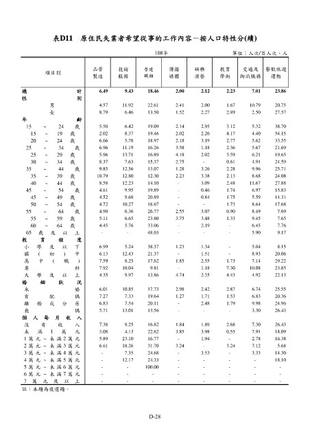 表D11 原住民失業者希望從事的工作內容-按人口特性分(續)