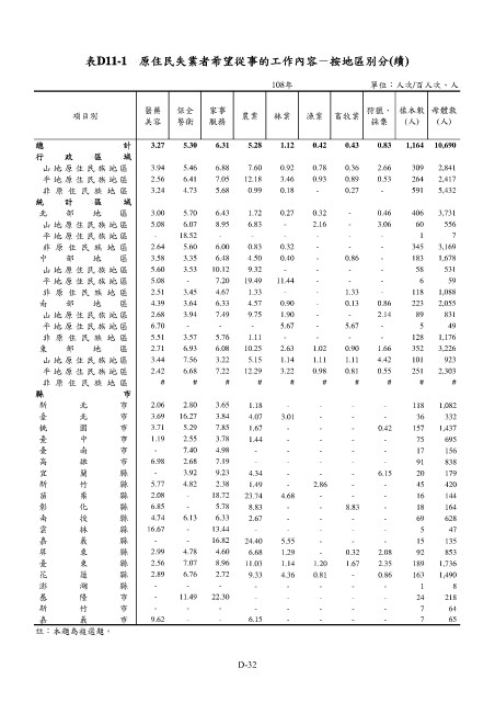表D11-1 原住民失業者希望從事的工作內容-按地區別分(續)