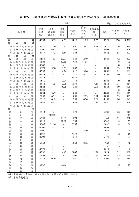 表D12-1 原住民想工作而未找工作者沒有找工作的原因-按地區別分