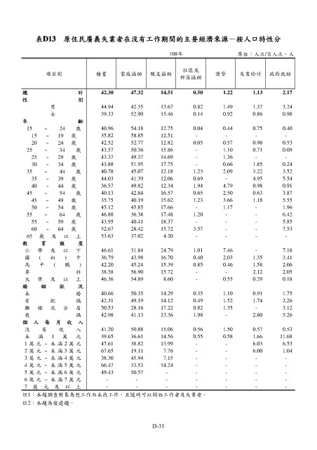 表D13 原住民廣義失業者在沒有工作期間的主要經濟來源-按人口特性分