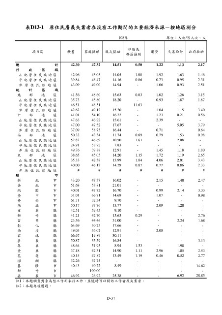 表D13-1 原住民廣義失業者在沒有工作期間的主要經濟來源-按地區別分