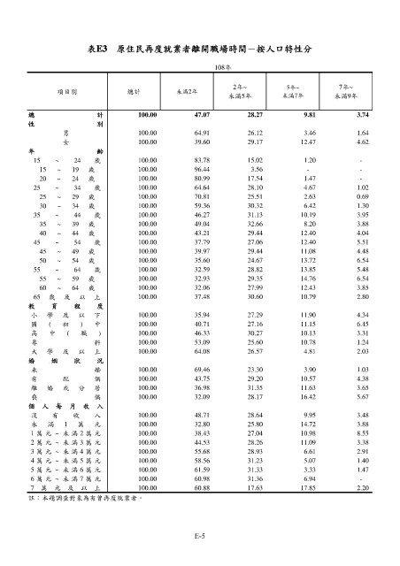 表E3 原住民再度就業者離開職場時間-按人口特性分