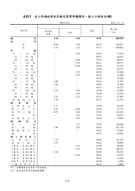 表E11 有工作過的原住民發生勞資爭議情形-按人口特性分(續)