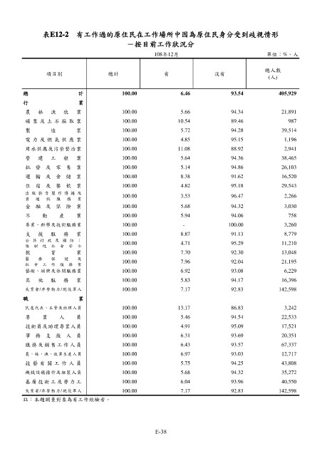 表E12-2 有工作過的原住民在工作場所中因為原住民身分受到歧視情形