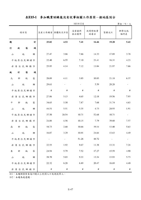 表E15-1 參加職業訓練後沒有從事相關工作原因-按地區別分