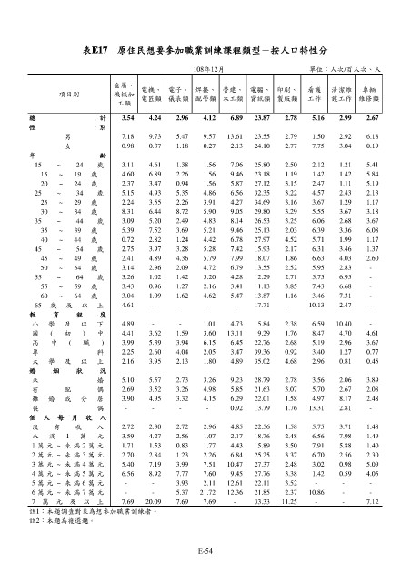 表E17 原住民想要參加職業訓練課程類型-按人口特性分