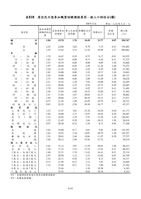 表E18 原住民不想參加職業訓練課程原因-按人口特性分(續)