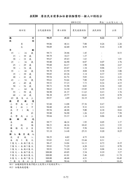 表E20 原住民目前參加社會保險情形-按人口特性分