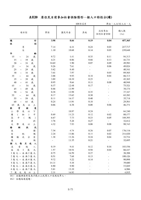 表E20 原住民目前參加社會保險情形-按人口特性分(續)