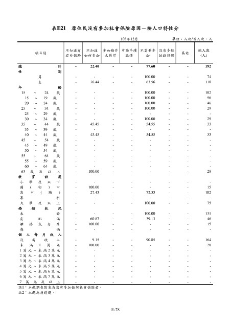 表E21 原住民沒有參加社會保險原因-按人口特性分