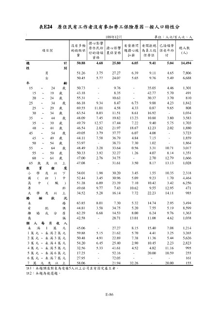 表E24 原住民有工作者沒有參加勞工保險原因-按人口特性分