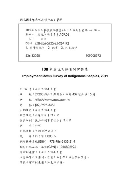 108 年原住民就業狀況調查/原住民族委員會編. –初版.--