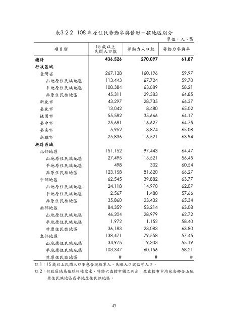 表3-2-2 108 年原住民勞動參與情形-按地區別分