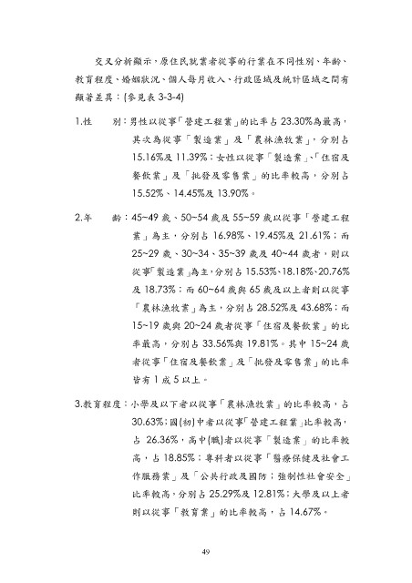 交叉分析顯示,原住民就業者從事的行業在不同性別、年齡、
