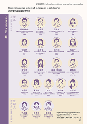 漢族 太魯閣族 排灣族 卡那卡那富族 阿美族 漢族 阿美族 排灣族 第二屆董監事名單更新時間:2024 年 9 月