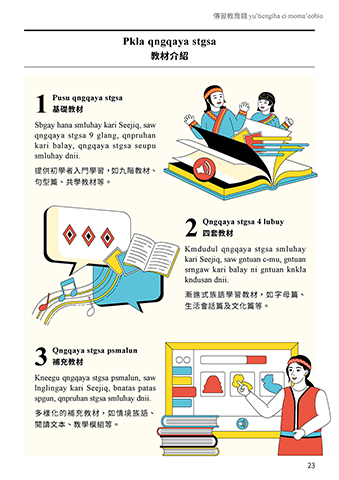 漸進式族語學習教材,如字母篇、