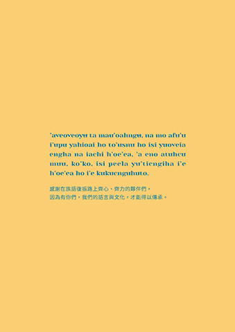 ’aveoveoyu ta mau’oahngu, na mo afu’u i’upu yahioai ho to’usnu ho isi yuoveia engha na iachi h’oe’ea, ’a eno atuhcu muu, ko’ko, isi peela yu’ticngiha i’e h’oe’ea ho i’e kukucnguhuto. 感謝在族語復振路上齊心、齊力的夥伴們, 因為有你們,我們的語言與文化,才能得以傳承。