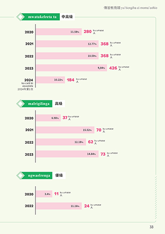 自����年起,族語能力認證測驗改採每年進行�次初級、中級、中高級測驗,高級測驗為每年�次,優級測驗為�年�次。 2021 ��.��% 368 ku umase