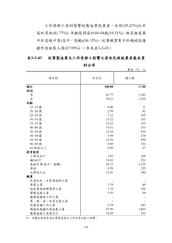 表3-3-43 從事製造業且工作受移工影響之原住民族就業者基本資