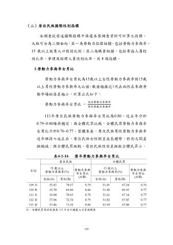 113年原住民族勞動力參與率女男比為0.80,近五年介於