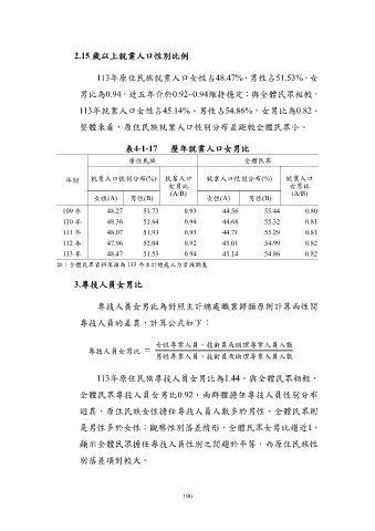113年原住民族就業人口女性占48.47%、男性占51.53%, 女