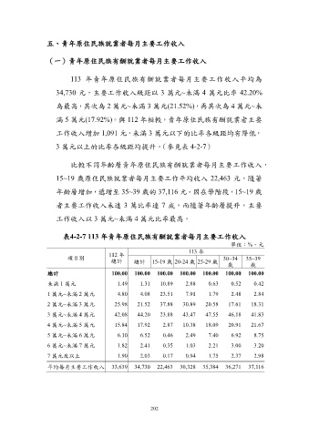 表4-2-7 113 年青年原住民族有酬就業者每月主要工作收入