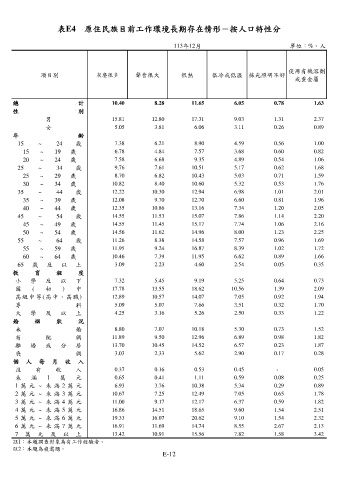 表E4 原住民族目前工作環境長期存在情形-按人口特性分