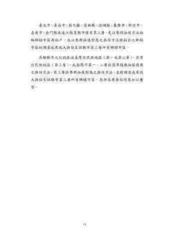 臺北市、臺南市、彰化縣、雲林縣、澎湖縣、基隆市、新竹市、 嘉義市、金門縣及連江縣等縣市僅有第三層,是以集群抽樣方法抽 取鄉鎮市區再抽戶,故以集群抽樣對應之推估方法將抽出之鄉鎮 市區的調查成果放大推估至該縣市第三層所有鄉鎮市區。 其餘縣市之行政區涵蓋原住民族地區(第一或第二層)、非原 住民族地區(第三層),此些縣市第一、二層採簡單隨機抽樣對應 之推估方法,第三層採集群抽樣對應之推估方法,並將調查成果放 大推估至該縣市第三層所有鄉鎮市區,再將各層推估結果加以彙 整。 18