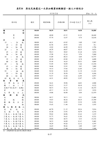 表E16 原住民族最近一次參加職業訓練類型-按人口特性分