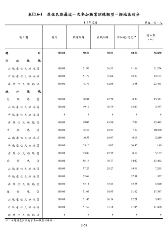 表E16-1 原住民族最近一次參加職業訓練類型-按地區別分