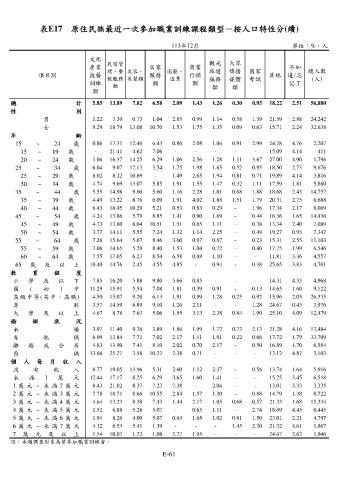 表E17 原住民族最近一次參加職業訓練課程類型-按人口特性分(續)