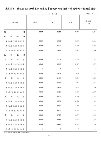 表E20-1 原住民族參加職業訓練後從事與職訓內容相關工作的情形-按地區別分
