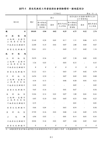 表F1-1 原住民族有工作者投保社會保險情形-按地區別分