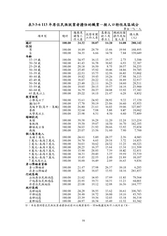 表3-3-6 113 年原住民族就業者擔任的職業-按人口特性及區域分